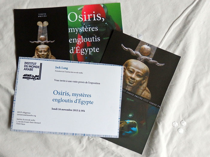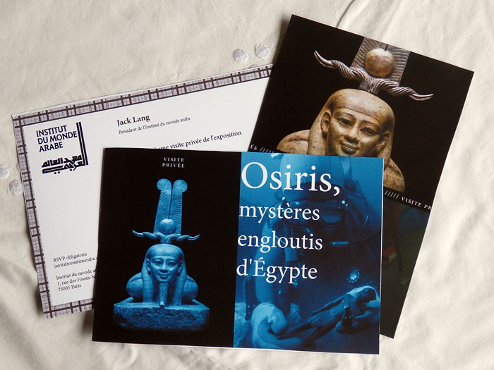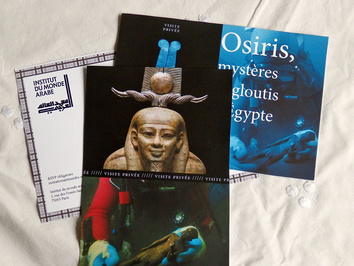 L'Institut du Monde Arabe souhaite convier certaines personnalités à une visite privée de l'exposition. "Osiris, mystères engloutis d'Egypte". La commande consiste à créer un carton d'invitation diffusé par mailing.