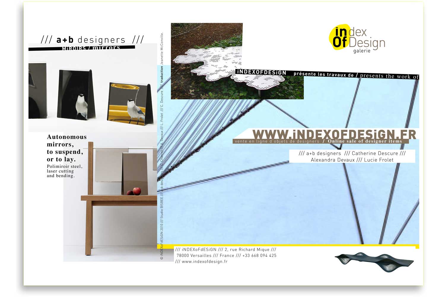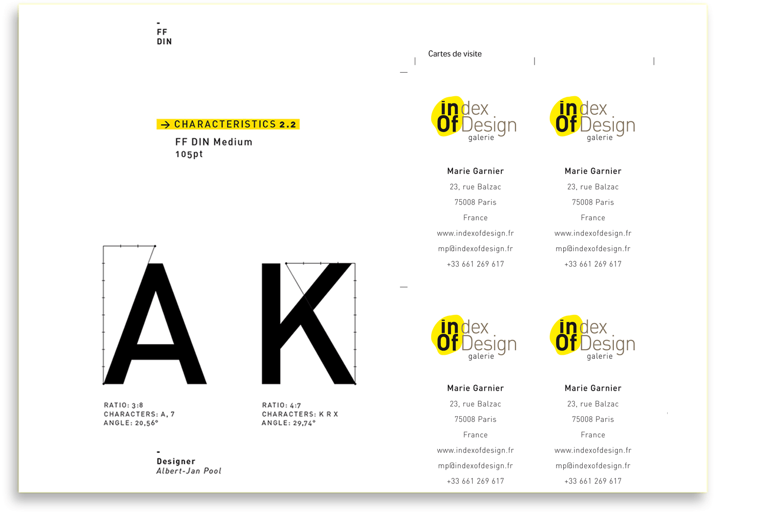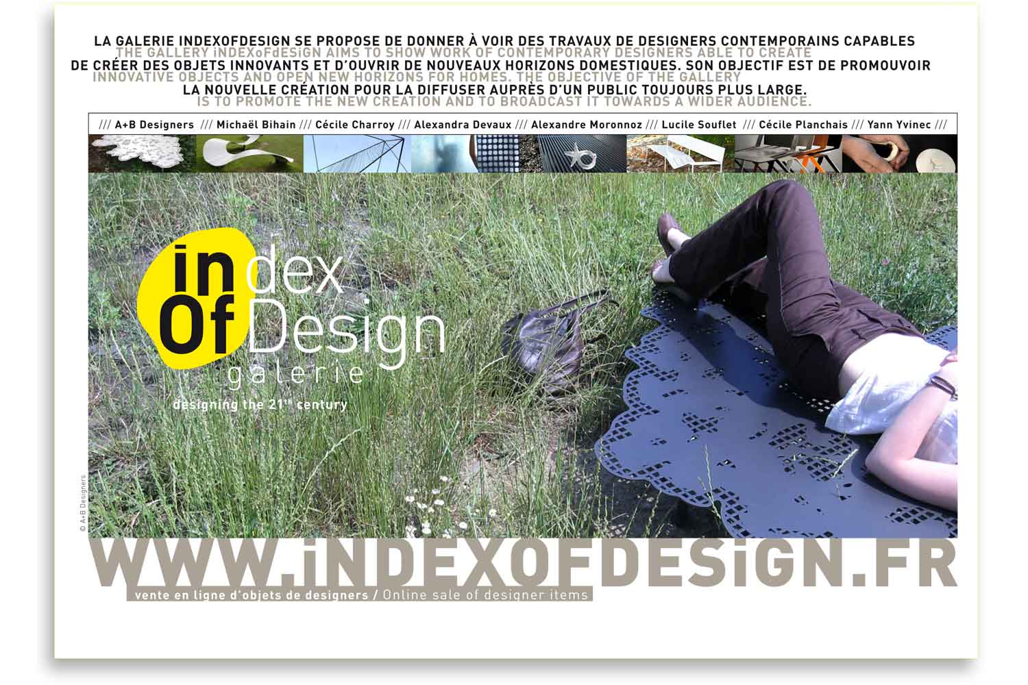 Pour mettre en avant les travaux de jeunes designers contemporains qu'elle propose à l'édition en série limitée, la galerie INDEXoFdESIGN avait besoin d'outils de communication à la hauteur des enjeux de la création du XXIème siècle. J'ai accompagné la galerie dans la définition de son identité visuelle avec pour unique mission de la positionner dans l'univers du très haut de gamme. Dans cette optique, j'ai travaillé sur un style épuré mais efficace articulé autour de deux axes fondateurs : la création d'un logotype élégant alliant un jeu de couleurs chaudes et intimistes d'une part, et le choix d'une typographie aux courbes d'une fluidité incroyable, la FF DIN créée par Albert-Jan Pool d'autre part.