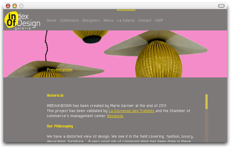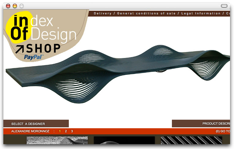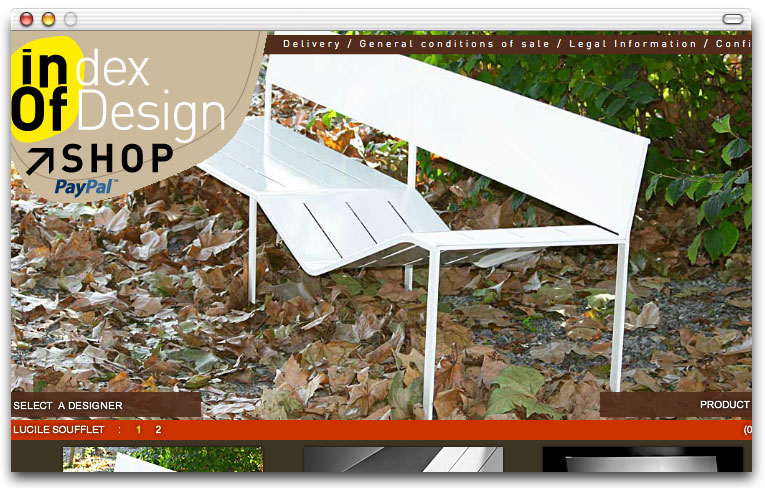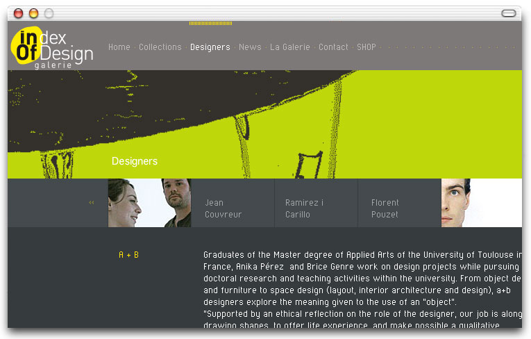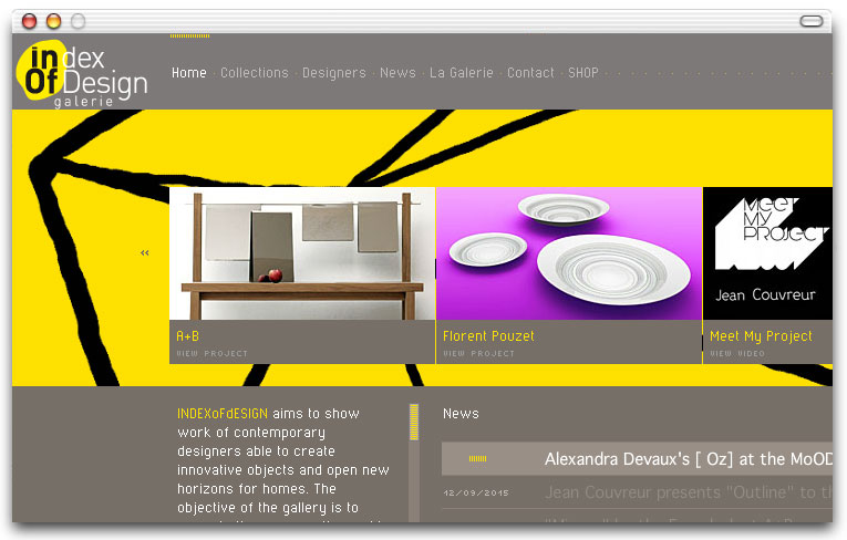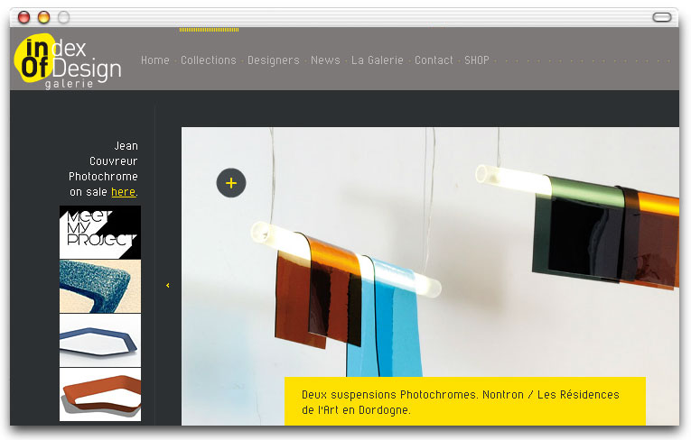 Pour mettre en avant les travaux de jeunes designers contemporains qu'elle propose à l'édition en série limitée, la galerie INDEXoFdESIGN avait besoin d'outils de communication à la hauteur des enjeux de la création du XXIème siècle. J'ai accompagné la galerie dans la définition de son identité visuelle avec pour unique mission de la positionner dans l'univers du très haut de gamme. Dans cette optique, j'ai proposé un site en Flash, seule technologie capable de proposer des effets de zooms intuitifs plein cadre et une navigation aussi bien pour droitiers que pour gauchers. La mise à jour se fait via des fichiers xml.