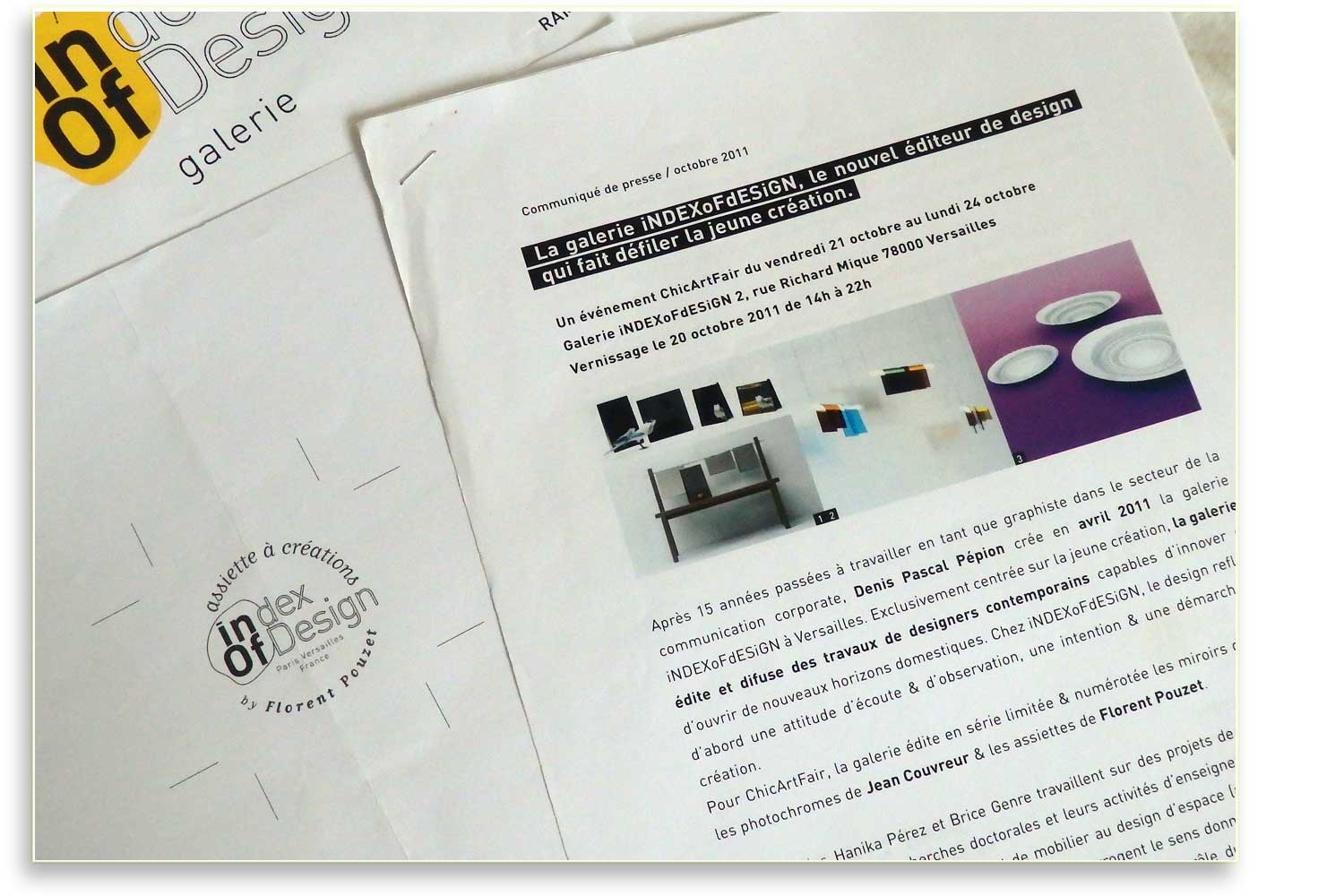 Pour mettre en avant les travaux de jeunes designers contemporains qu'elle propose à l'édition en série limitée, la galerie INDEXoFdESIGN avait besoin d'outils de communication à la hauteur des enjeux de la création du XXIème siècle. J'ai accompagné la galerie dans la définition de son identité visuelle avec pour unique mission de la positionner dans l'univers du très haut de gamme. Dans cette optique, j'ai travaillé sur un style épuré mais efficace articulé autour de deux axes fondateurs : la création d'un logotype élégant alliant un jeu de couleurs chaudes et intimistes d'une part, et le choix d'une typographie aux courbes d'une fluidité incroyable, la FF DIN créée par Albert-Jan Pool d'autre part.